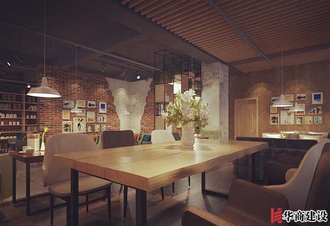 在本案工業(yè)風咖啡館吊頂設(shè)計上,我們依然采用了大面積的裸露水泥頂,只是簡單的做了色彩的處理,另外在咖啡館的局部區(qū)域,我們的吊頂風格采用了木質(zhì)鏤空格柵的裝飾設(shè)計手法,與店面內(nèi)的裝飾風格毫不違和、自成一體。