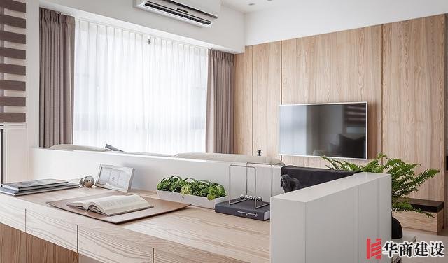 客廳就在餐廳一側(cè),沒有陽臺,大大的落地窗光線比較好,米色的真皮沙發(fā),原木硬包的電視柜,簡約大氣,視覺感很舒適。沙發(fā)背景墻就是和書房之間的隔墻,原本的墻面直接拆掉了,沙發(fā)背景墻變成了書桌的背板,節(jié)省空間,這樣兩個空間的光線都相互融合,很敞亮。