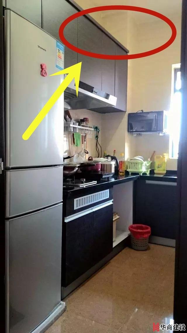 3、櫥柜上頭沒做到頂,導(dǎo)致空出一大片空白地方,打掃的時(shí)候又是搬梯子又是洗抹布真的心累!要是不去打掃,上面就是蟑螂的基地!光看著都覺得頭疼!