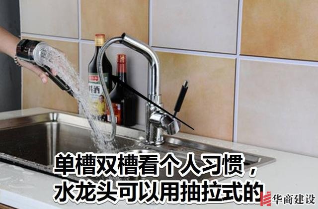 8、廚房水槽到底是用單槽還是雙槽好,這個主要還是看個人的習慣的,有的人喜歡大單槽,整個鍋放進去洗都沒問題,有些人就喜歡小雙槽一面洗菜一面瀝水,但是我家瀝水槽的經常不用,刷個鍋弄的到處是水的,還有水龍頭可以用抽拉式的,方便的很。